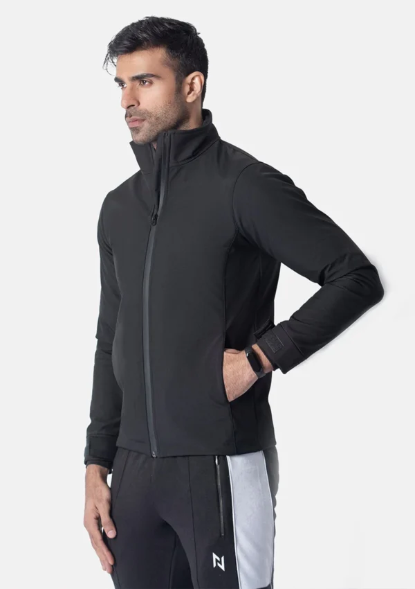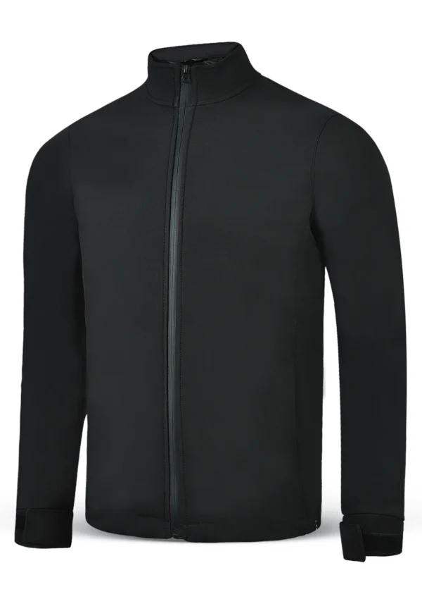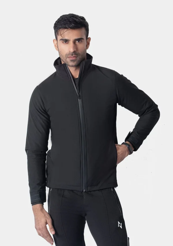 Softshell jacket in windproof, water-repellent functional fabric with a water column rating of 20,000 mm. Hood with a small peak and a concealed, elastic drawstring at the front and back to help the hood stay in place and fit snugly on the head. Stand-up collar and a zip down the front with a chin guard. Gently dropped shoulders, long sleeves with an adjustable hook and loop tab at the cuffs. Chest pocket with a concealed zip and zipped front pockets with a flap. Partly lined in mesh.